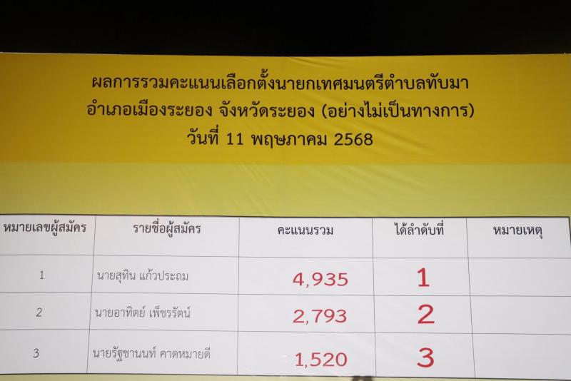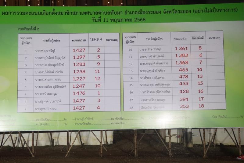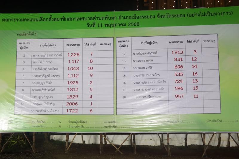ผลการรวมคะแนนเลือกตั้งนายกเทศมนตรีตำบลทับมา และ สมาชิกสภาเทศบาลตำบลทับมา อำเภอเมืองระยอง จังหวัดระยอง (อย่างไม่เป็นทางการ) วันที่ 11 พฤษภาคม 2568