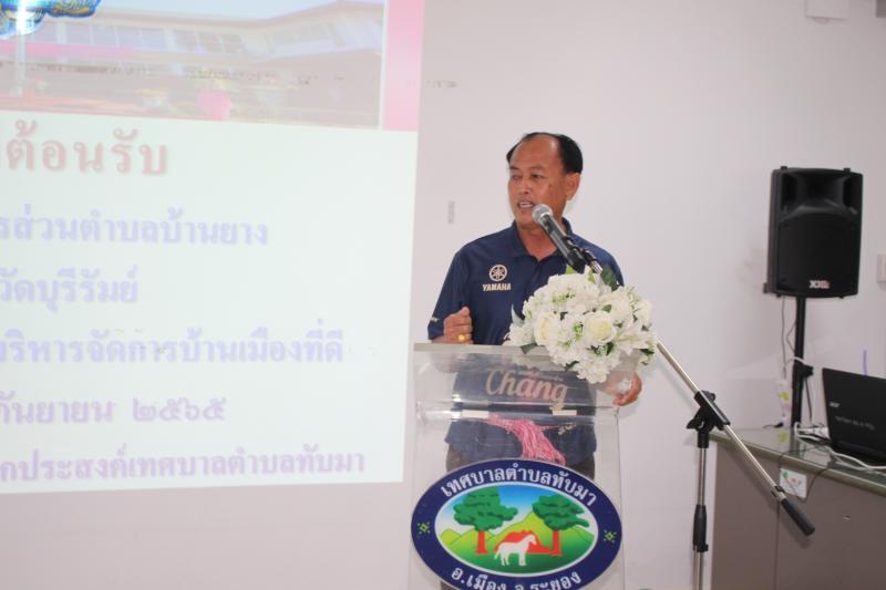 รายละเอียด : เมื่อวันที่ 23 กันยาน 2565 นายประเสริฐ วงษ์ศรี นายกเทศมนตรีตำบลทับมา กล่าวต้อนรับคณะศึกษาดูงาน พร้อมด้วยนายชูชาติ คงทน รองนายกเทศมนตรีตำบลทับมา ร.ต.อ.ดำหริ จุติ ที่ปรึกษานายกเทศมนตรีตำบลทับมา ร่วมต้อนรับคณะศึกษาดูงาน จากองค์การบริหารส่วนตำบลบ้านยาง จังหวัดบุรีรัมย์" นำโดยท่านทินกร กัณหา นายกองค์การบริหารส่วนตำบลบ้านยาง จังหวัดบุรีรัมย์ พร้อมด้วยคณะศึกษาดูงาน ซึ่งประกอบด้วยคณะผู้บริหาร สมาชิกสภาฯ หัวหน้าส่วนราชการ เจ้าหน้าที่ พนักงาน กำนัน ผู้นำชุมชน จำนวน 90 คน มาศึกษาดูงานเรื่องการบริหารจัดการบ้านเมืองที่ดี โดยมีนายสรวิทย์ สกุลวงศ์ รองปลัดเทศบาลตำบลทับมา และนางพิชชานันท์ บุญช่วย นักวิชาการสาธารณสุขปฏิบัติการ รักษาราชการแทน หัวหน้าฝ่ายบริหารงานสาธารณสุขนักวิชาการสาธารณสุข เป็นผู้บรรยายพิเศษแก่คณะศึกษาดูงานในครั้งนี้ ณ ห้องประชุมอาคารเอนกประสงค์ 5 ชั้น