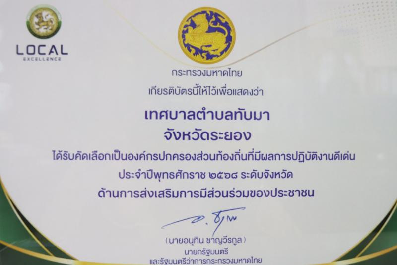 เทศบาลตำบลทับมา ผ่านการคัดเลือกเป็นองค์กรปกครองส่วนท้องถิ่นที่มีผลปฏิบัติงานดีเด่น ประจำปี พ.ศ. 2568