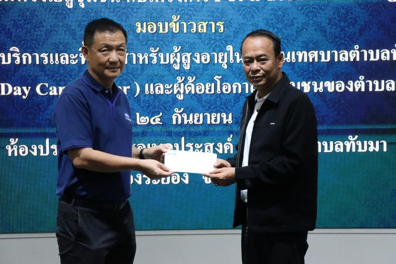 รายละเอียด : วันที่ 24 กันยายน 2568 เวลา 09.30 น. นายสุทิน แก้วประถม นายกเทศมนตรีตำบลทับมา กล่าวต้อนรับและขอบคุณ คณะผู้บริหารและพนักงาน บริษัท ฟอร์ด เอกระยอง (Ford EK Rayong) พร้อมด้วยคณะผู้บริหาร หัวหน้าส่วนราชการ พนักงานและเจ้าหน้าที่เทศบาลตำบลทับมา ร่วมให้การต้อนรับ ในการจัดกิจกรรม “Ford Global Caring Month แบ่งปันความห่วงใยสู่ชุมชน” กิจกรรมดังกล่าวประกอบด้วย การมอบข้าวสารและอาหารแห้ง ให้แก่ผู้สูงอายุภายในศูนย์บริการและฟื้นฟูสำหรับผู้สูงอายุในชุมชน เทศบาลตำบลทับมา (Thapma Day Care Center) และ การลงพื้นที่เยี่ยมบ้านผู้ป่วยติดเตียงและผู้ด้อยโอกาสในเขตตำบลทับมา เพื่อมอบสิ่งของจำเป็นและสร้างขวัญกำลังใจแก่ประชาชนกลุ่มเปราะบาง ในการนี้ นายสมศักดิ์ พะเนียงทอง กรรมการผู้จัดการบริษัท ฟอร์ด เอกระยอง ได้กล่าวถึงวัตถุประสงค์ของกิจกรรมว่า เป็นส่วนหนึ่งของ โครงการจิตอาสาระดับโลกของฟอร์ด ซึ่งจัดขึ้นเป็นประจำทุกปี เพื่อส่งเสริมการมีส่วนร่วมของพนักงานและชุมชน ในการช่วยเหลือสังคมและสร้างสิ่งดีงามให้เกิดขึ้นในพื้นที่ ส่งต่อรอยยิ้มและความอิ่มท้องให้กับชุมชนในจังหวัดระยอง สร้างสังคมที่อิ่มใจไปพร้อมกัน เพราะทุกการแบ่งปัน คือพลังที่สร้างสังคมให้น่าอยู่มากขึ้น