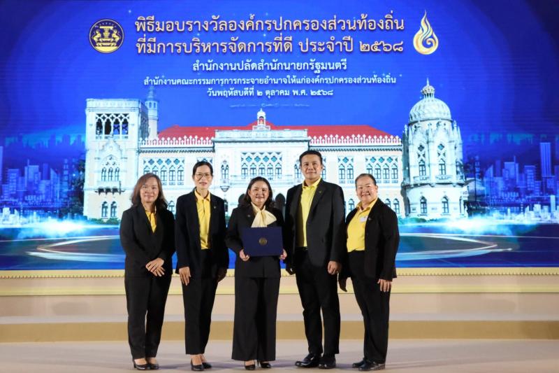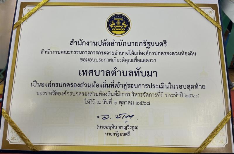 เทศบาลตำบลทับมา เข้ารับรางวัลองค์กรปกครองส่วนท้องถิ่นที่เข้าสู่รอบการประเมินในรอบสุดท้าย "ประเภทดีเลิศ" ประจำปีงบประมาณ พ.ศ. 2568