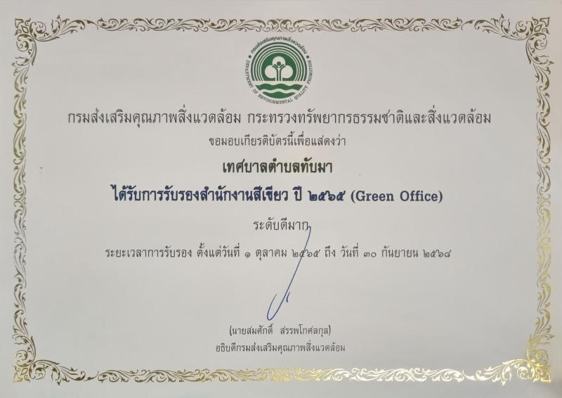 เทศบาลตำบลทับมา รับโล่ตราสัญลักษณ์ รางวัล Green Office ระดับดีมาก ประจำปี 2565