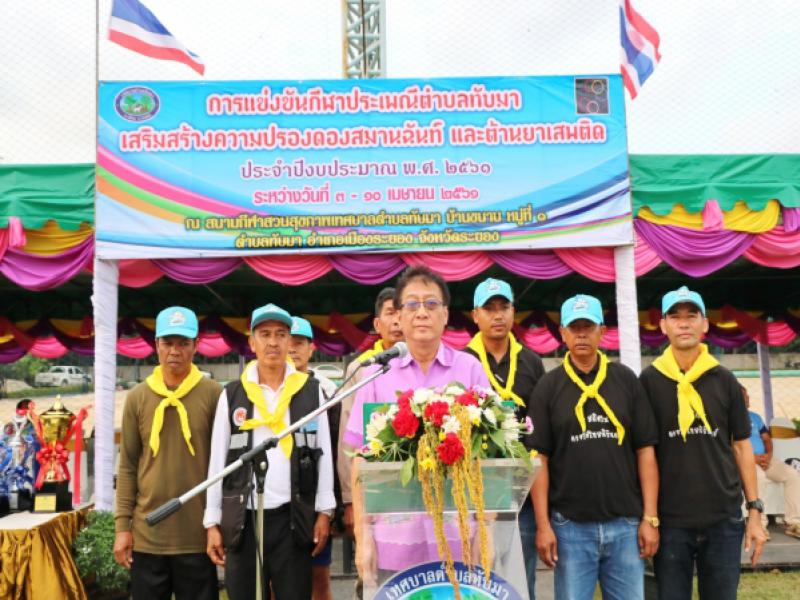 รายละเอียด : เทศบาลตำบลทับมา จัดแข่งขันกีฬาเสริมสร้างความปรองดองสมานฉันท์ วันที่ 3 เมษายน 2561 เวลา 17.00 น. นายธีรวัฒน์ สุดสุข รองผู้ว่าราชการจังหวัดระยอง ให้เกียรติเป็นประธานเปิดโครงการแข่งขันกีฬาประเพณีตำบลทับมา เสริมสร้างความปรองดองสมานฉันท์และต้านยาเสพติด ประจำปี พ.ศ. 2561 โดยมีนายประเสริฐ วงษ์ศรี นายกเทศมนตรีตำบลทับมา เป็นผู้กล่าวรายงานวัตถุประสงค์โครงการดังกล่าว ซึ่งจัดขึ้นเพื่อส่งเสริมให้เด็ก เยาวชนและประชาชนทั่วไป ได้ตระหนักถึงการการออกกำลังกายสร้างความปรองดองสมานฉันท์เกิดความสามัคคี ความเสียสละ มีน้ำใจเป็นนักกีฬา และใช้เวลาว่างให้เกิดประโยชน์ห่างไกลจากยาเสพติด นายกเทศมนตรี กล่าวว่า “การแข่งขันกีฬาเป็นการส่งเสริมด้านสุขภาพให้แข็งแรง นำไปสู่การพัฒนาท้องถิ่นให้เข็มแข็ง และเชื่อมความสัมพันธ์ระหว่างหน่วยงาน ผู้นำชุมชน นำไปสู่การรวมพลังขับเคลื่อนการประสานงานทุกระดับให้สอดคล้องกับการเปลี่ยนแปลง ตลอดจนทำให้ชุมชนอยู่เย็นเป็นสุขและมั่นคงด้วยการออกกำลังกาย” ภายในงาน มีการลงนามบันทึกข้อตกลงความร่วมมือ (MOU) ระหว่างเทศบาลตำบลทับมา และศูนย์กีฬาตำบลทับมา คณะกรรมการกลุ่มกีฬาชุมชน เพื่อบูรณาการความร่วมมือในการส่งเสริมสนับสนุนการเล่นกีฬาและการออกกำลังกายให้กับประชาชนในพื้นที่ ทั้งนี้ การแข่งขันกีฬาตำบลทับมาจัดขึ้นระหว่างวันที่ 3-10 เมษายน 2561 ซึ่งมีการแข่งขันกีฬาประกอบด้วย การแข่งขันจักรยาน ฟุตบอล วอลเลย์บอล และกีฬาพื้นบ้าน ณ สนามกีฬาสวนสุขภาพเทศบาลตำบลทับมา บ้านขนาบ หมู่ที่ 1 ต.ทับมา อ.เมืองระยอง จ.ระยอง