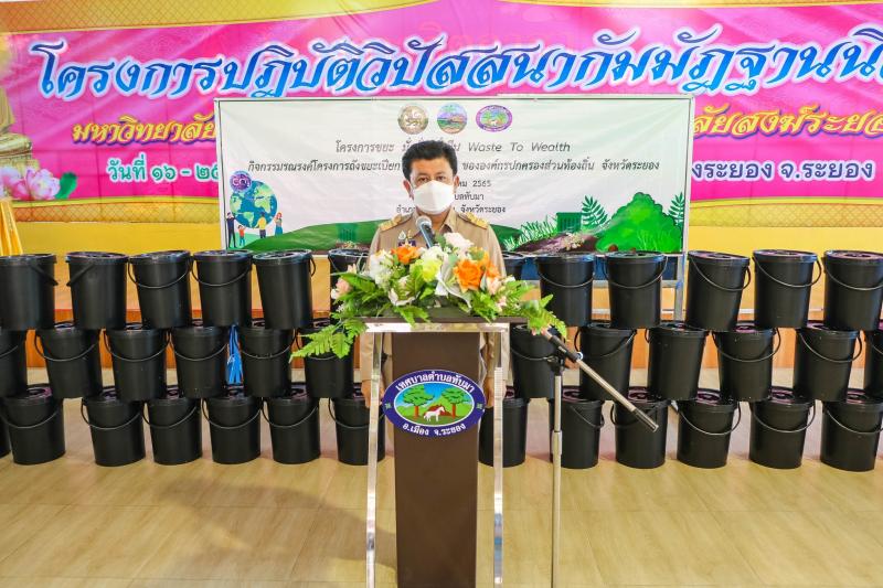รายละเอียด : วันที่ 6 ธันวาคม 2565 เวลา 09.00 น. นายประเสริฐ วงษ์ศรี นายกเทศมนตรีตำบลทับมา มอบหมายให้นายฉัตร แก่กล้า รองนายกเทศมนตรีตำบลทับมา เป็นประธานเปิดโครงการขยะ มั่งคั่ง ยั่งยืน Waste To Wealth กิจกรรมรณรงค์โครงการถังขยะเปียก ลดโลกร้อน มีนางสาวเรวีญา ขจิตเนติธรรม ปลัดเทศบาลตำบลทับมา เป็นผู้กล่าววัตถุประสงค์การจัดโครงการฯ เพื่อลดปริมาณขยะ ลดการปลดปล่อยก๊าซเรือนกระจก ลดโลกร้อนและลดงบประมาณค่าใช้จ่ายในการบริหารจัดการขยะต่อยอดกระบวนการ ROSES ในการพัฒนาผลิตภัณฑ์จากขยะสร้างรายได้แก่ชุมชน แก้ไขปัญหาสิ่งแวดล้อม ยึดหลักปรัชญาเศรษฐกิจพอเพียง ขยายผลสู่การท่องเที่ยว สร้างเศรษฐกิจในชุมชนอย่างยั่งยืน ภายใต้อัตลักษณ์ตำบลทับมา "เขา คลอง ครัวระยอง กลองยาว" เพื่อคิดค้นแนวทางพัฒนานวัตกรรมในการแก้ไขปัญหาสิ่งแวดล้อมแนวทางใหม่ ที่ใช้ถ่ายทอดแก่ประชาชนในเขตและชุมชนภายนอก สู่การยกระดับคุณภาพชีวิตทุกเพศทุกวัย ทุกเชื้อชาติ ศาสนา เป็นต้นแบบการบริหารจัดการขยะและขยายผลในชุมชน