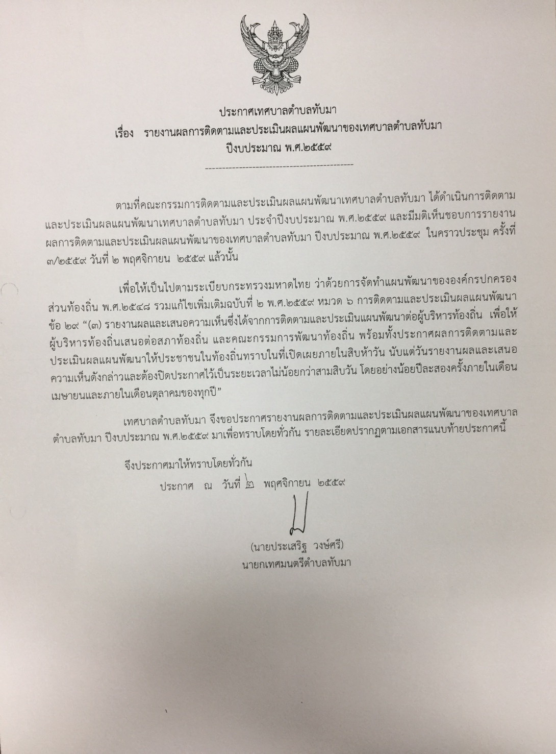 รายงานการติดตามและประเมินผลแผนพัฒนาของเทศบาลตำบลทับมา ประจำปีงบประมาณ พ.ศ. 2559