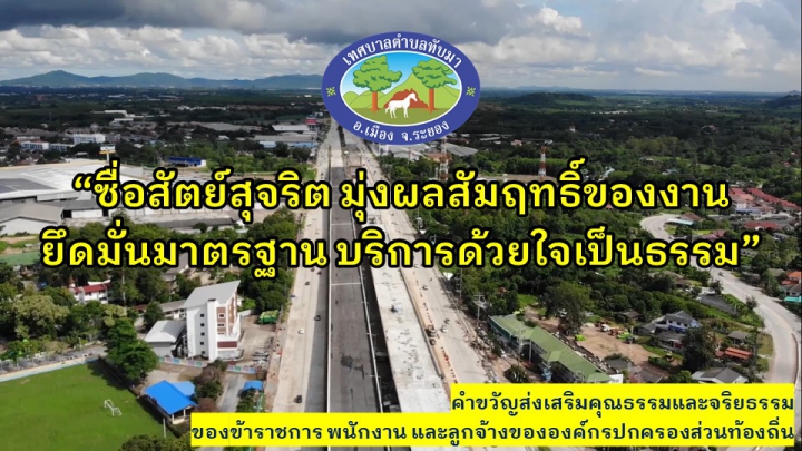 ชื่อเรื่อง : คำขวัญส่งเสริมคุณธรรมและจริยธรรม ของข้าราชการ พนักงานและลูกจ้างขององค์กรปกครองส่วนท้องถิ่น "ซื่อสัตย์สุจริต มุ่งผลสัมฤทธิ์ของงาน ยึดมั่นมาตรฐาน บริการด้วยใจเป็นธรรม"