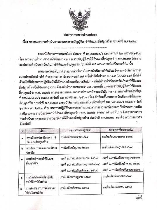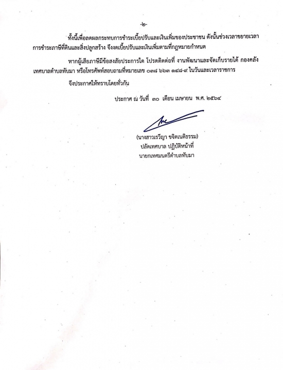 ชื่อเรื่อง : ประกาศเทศบาลตำบลทับมา เรื่อง ขยายเวลาการดำเนินการตามพระราชบัญญัติภาษีที่ดินและสิ่งปลูกสร้าง และการงดเบี้ยปรับ เงินเพิ่มตามพระราชบัญญัติภาษีที่ดินและสิ่งปลูกสร้าง พ.ศ.2562 เฉพาะการจัดเก็บภาษีในปี พ.ศ.2564
