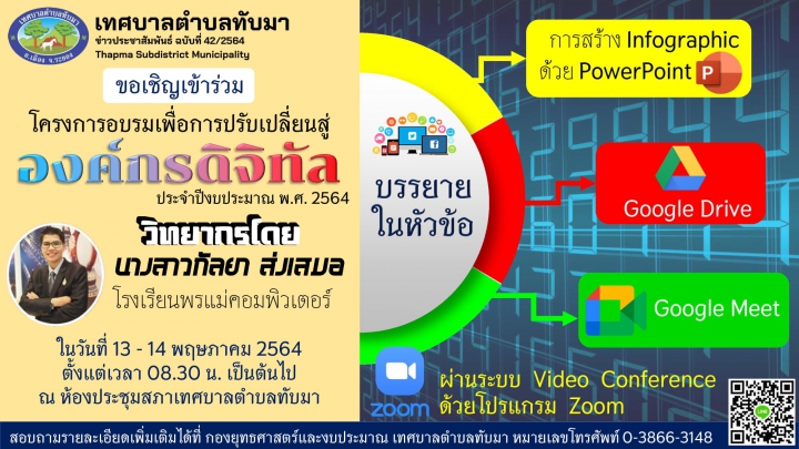 ภายในงานพบกับ การบรรยายในหัวข้อ การสร้าง Infographic ด้วยโปรแกรม PowerPoint, google Drive และGoogle Meet ผ่านระบบ Video Conference ด้วยโปรแกรม Zoom วันที่ 13 - 14 พฤษภาคม 2564 ตั้งแต่เวลา 08.30 น. เป็นต้นไป วิทยากรโดยนางสาวกัลยา ส่งเสมอ โรงเรียนพรแม่คอมพิวเตอร์ ณ ห้องประชุมสภาเทศบาลตำบลทับมา อำเภอเมืองระยอง จังหวัดระยอง