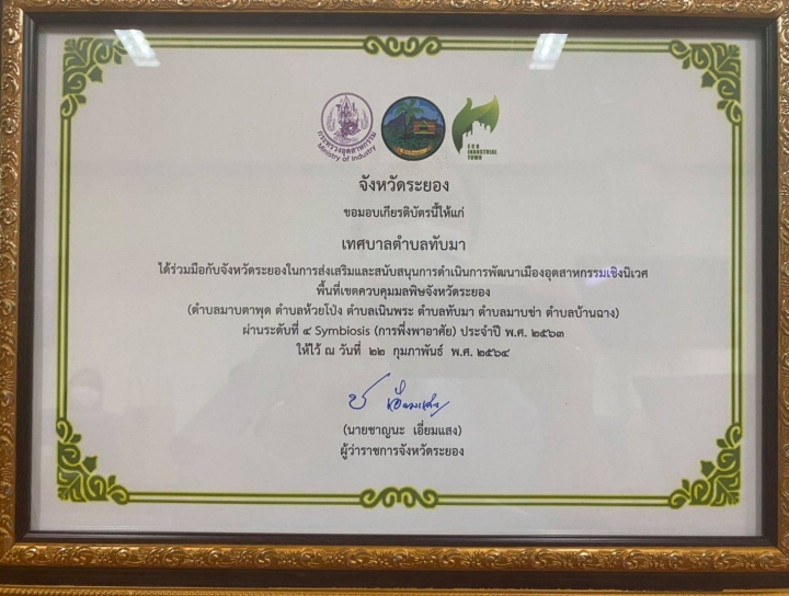 ชื่อเรื่อง : เทศบาลตำบลทับมา รับเกียรติบัตรความร่วมมือกับจังหวัดระยองในการส่งเสริมและสนับสนุนการดำเนินการพัฒนาเมืองอุตสาหกรรมเชิงนิเวศ พื้นที่เขตควบคุมมลพิษจังหวัดระยอง