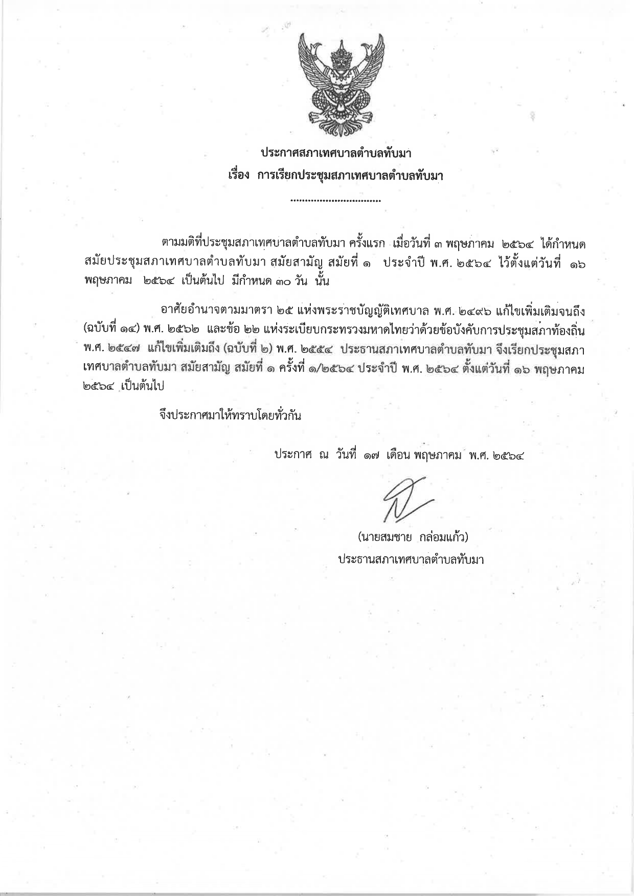ประกาศสภาเทศบาลตำบลทับมา เรื่อง การเรียกประชุมสภาเทศบาลตำบลทับมา