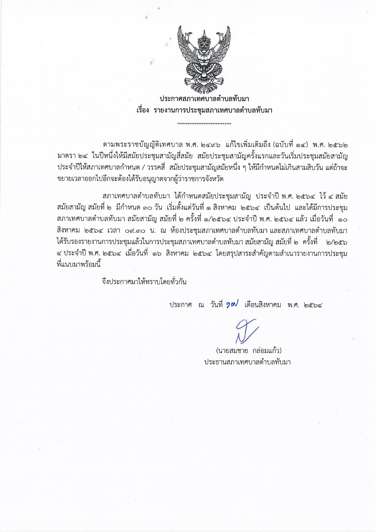 ประกาศสภาเทศบาลตำบลทับมา เรื่อง รายงานการประชุมสภาเทศบาลตำบลทับมา