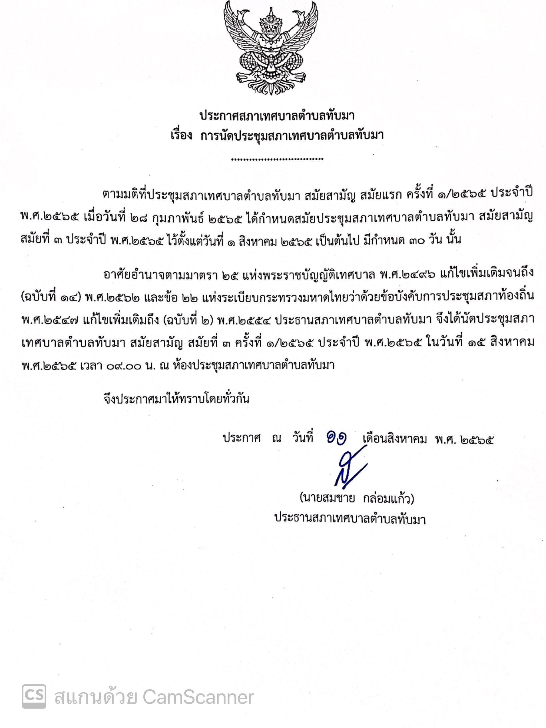 ประกาศสภาเทศบาลตำบลทับมา เรื่องการนัดประชุมสภา สมัยสามัญ สมัยที่ 3 ครั้งที่ 1/2565