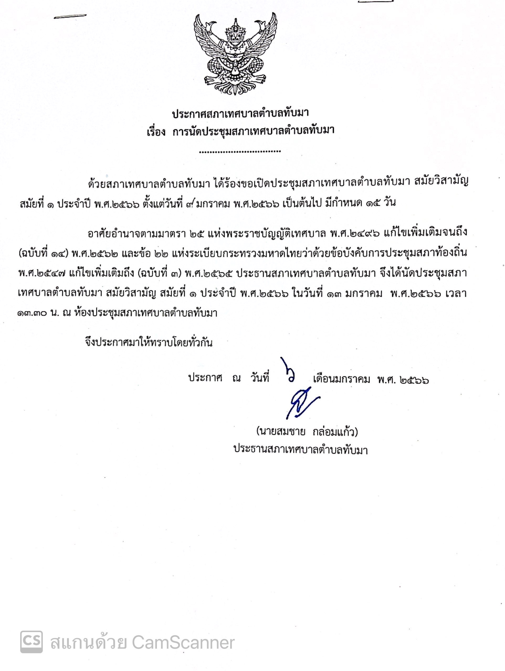 ประกาศสภาเทศบาลตำบลทับมา เรื่อง การนัดประชุมสภาเทศบาลตำบลทับมา สมัยวิสามัญ สมัยที่ 1