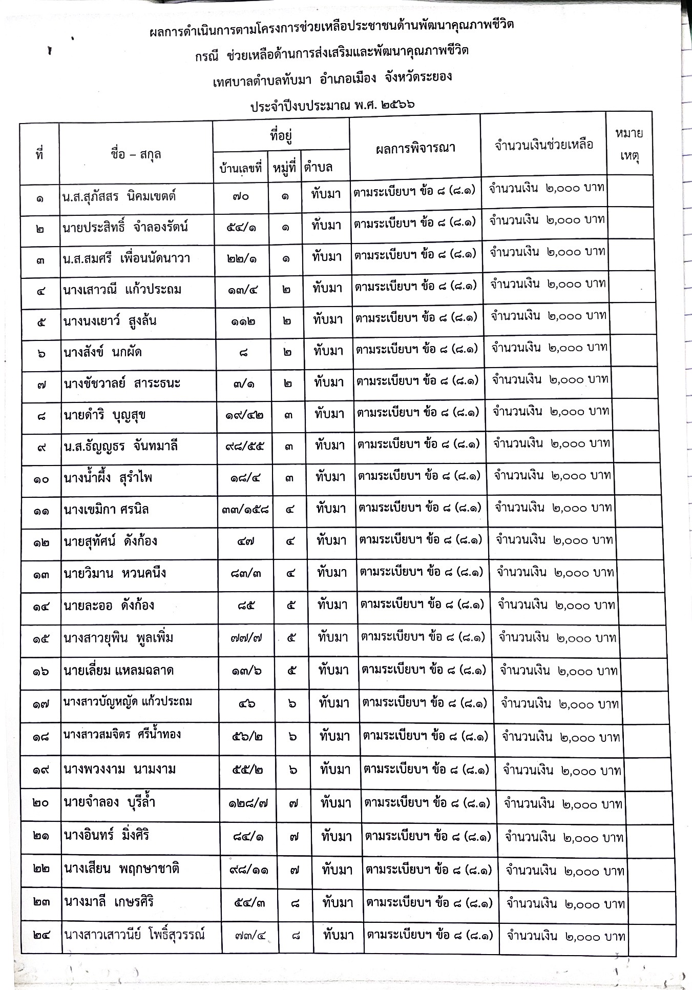 รายละเอียด : ด้วย ด้วยกองสวัสดิการสังคมเทศบาลตำบลททับมาได้ดำเนินการจัดทำโครงการช่วยเหลือประชาชนด้านพัฒนาคุณภาพชีวิตเพื่อให้ความช่วยเหลือครอบครัวผู้ประสบปัญหาทางสังคมลดความเหลื่อมล้ำทางสังคมตามมติคณะรัฐมนตรีในเขตพื้นที่เทศบาลตำบลทับมามาทั้ง 8 หมู่บ้าน ที่ได้รับผลกระทบเดือดร้อนหรือไม่สามารถช่วยเหลือตัวเองได้และดำเนินการเป็นที่เรียบร้อยแล้วโดยดำเนินการช่วยเหลือประชาชนด้านการส่งเสริมและพัฒนาคุณภาพชีวิตให้สามารถเข้าถึงปัจจัยพื้นฐานในการดำรงชีวิตได้อย่างปกติสุขในสังคมจำนวน 24 คนๆ ละ 2000 บาท เป็นเงินทั้งสิ้น 40,800 บาท ดังนั้นจึงขอความอนุเคราะห์กองยุทธศาสตร์และงบประมาณ ประชาสัมพันธ์ประกาศเทศบาลตำบลทับมาเรื่องผลการดำเนินโครงการดังกล่าวข้างต้น มาเพื่อเผยแพร่และประกาศให้ประชาชนได้รับทราบข้อมูลโดยทั่วกัน