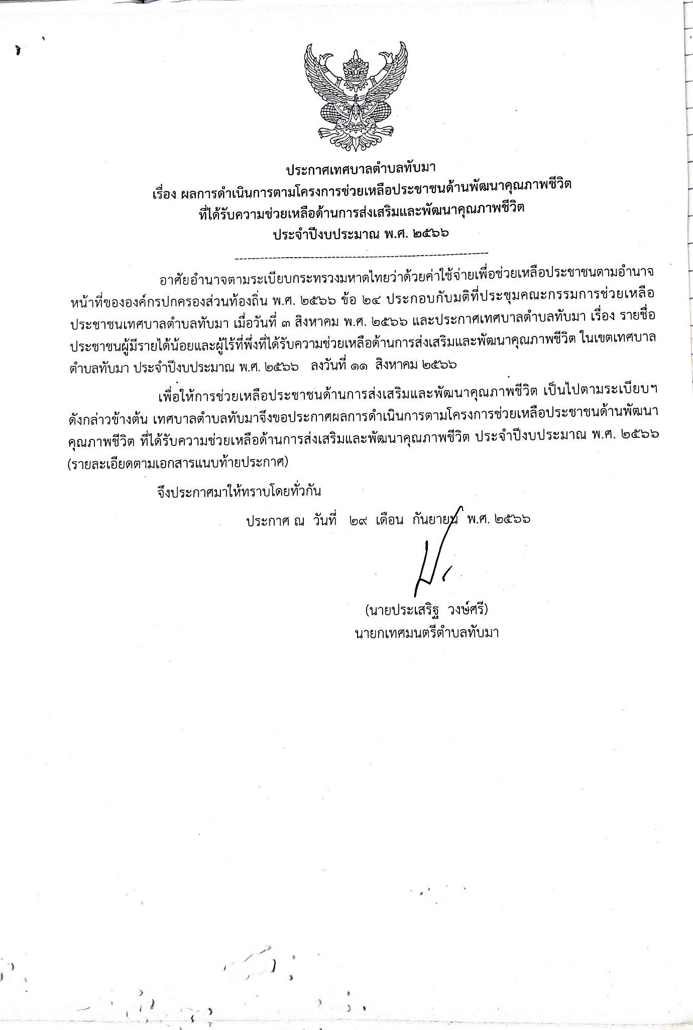 ชื่อเรื่อง : ประกาศเทศบาลตำบลทับมาเรื่องผลการดำเนินการตามโครงการช่วยเหลือประชาชนด้านพัฒนาคุณภาพชีวิตที่ได้รับความช่วยเหลือด้านการส่งเสริมและพัฒนาคุณภาพชีวิตประจำปีงบประมาณพ.ศ. 2566