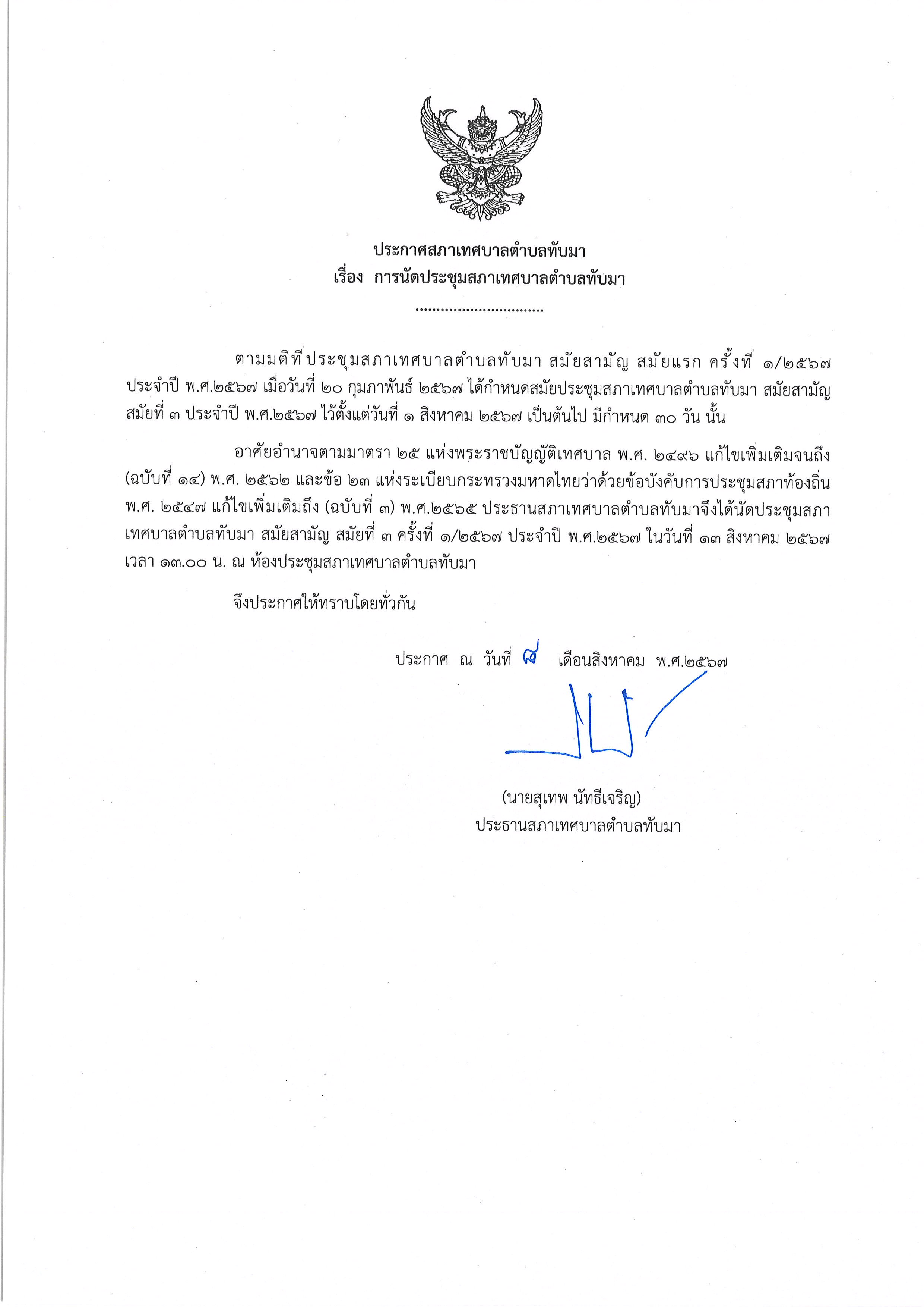 ประกาศสภาเทศบาลตำบลทับมา เรื่อง การนัดประชุมสภาเทศบาลตำบลทับมา สมัยสามัญ สมัยที่ 3 ครั้งที่ 1/2567 ประจำปี พ.ศ.2567