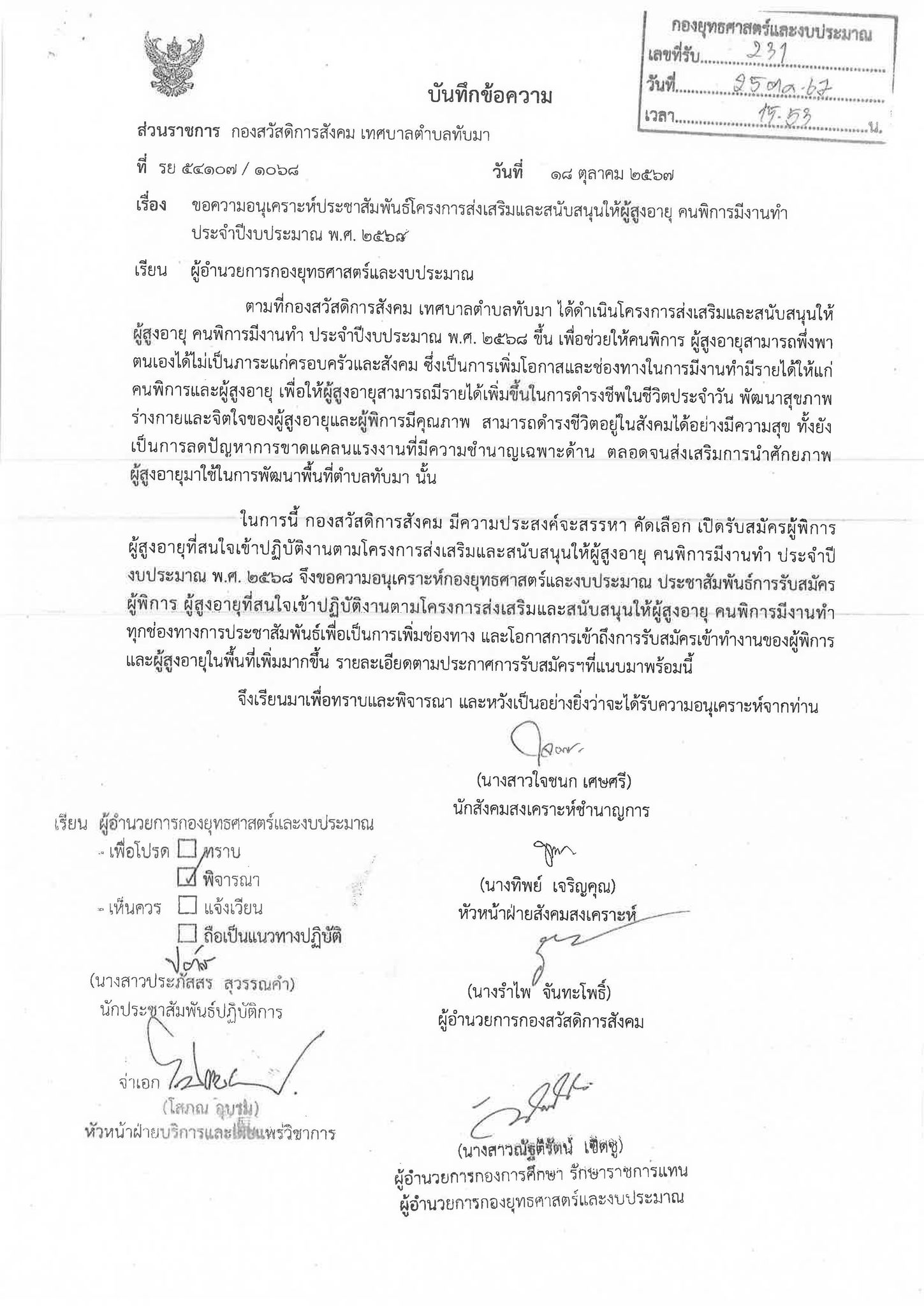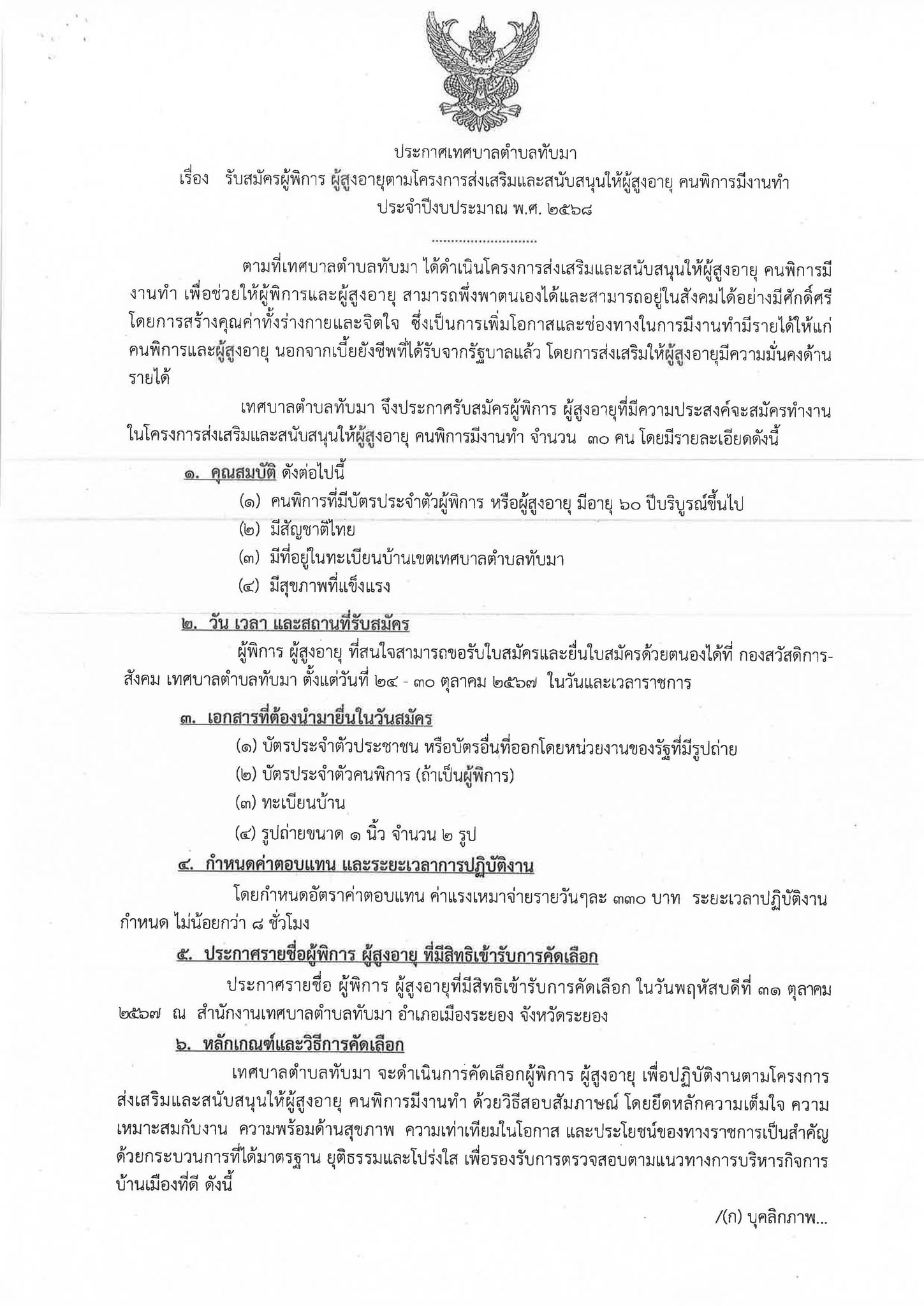 เรื่อง รับสมัครผู้พิการ ผู้สูงอายุตามโครงการส่งเสริมและสนับสนุนให้ผู้สูงอายุ คนพิการมีงานทำ ประจำปีงบประมาณ พ.ศ. 2568