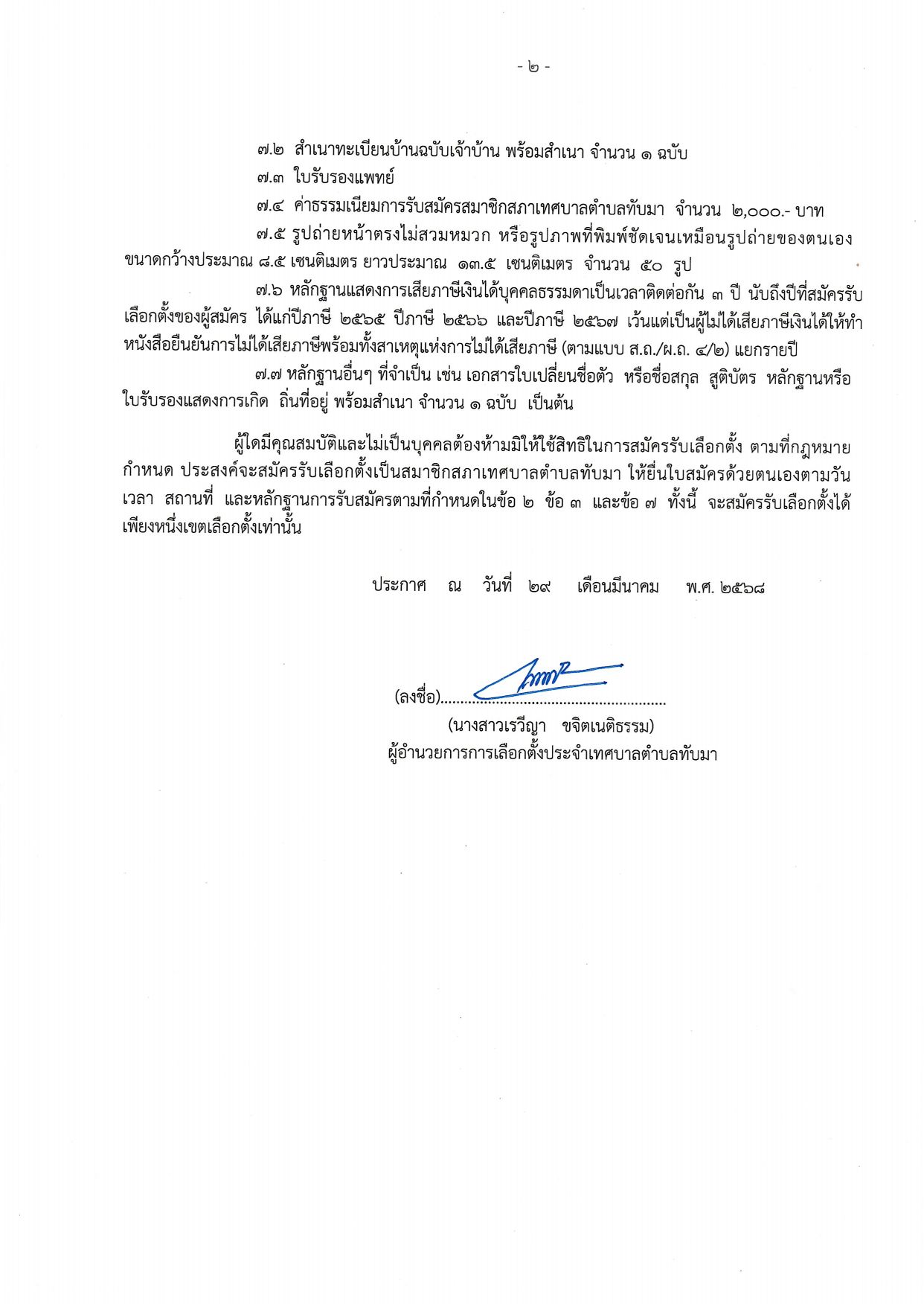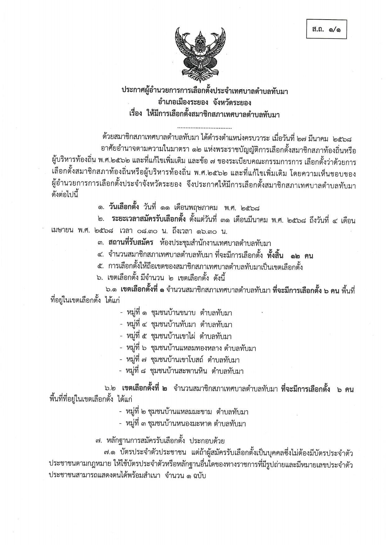 ประกาศผู้อำนวยการการเลือกตั้งประจำเทศบาลตำบลทับมา อำเภอเมืองระยอง จังหวัดระยอง เรื่อง ให้มีการเลือกตั้งสมาชิกสภาเทศบาลตำบลทับมา