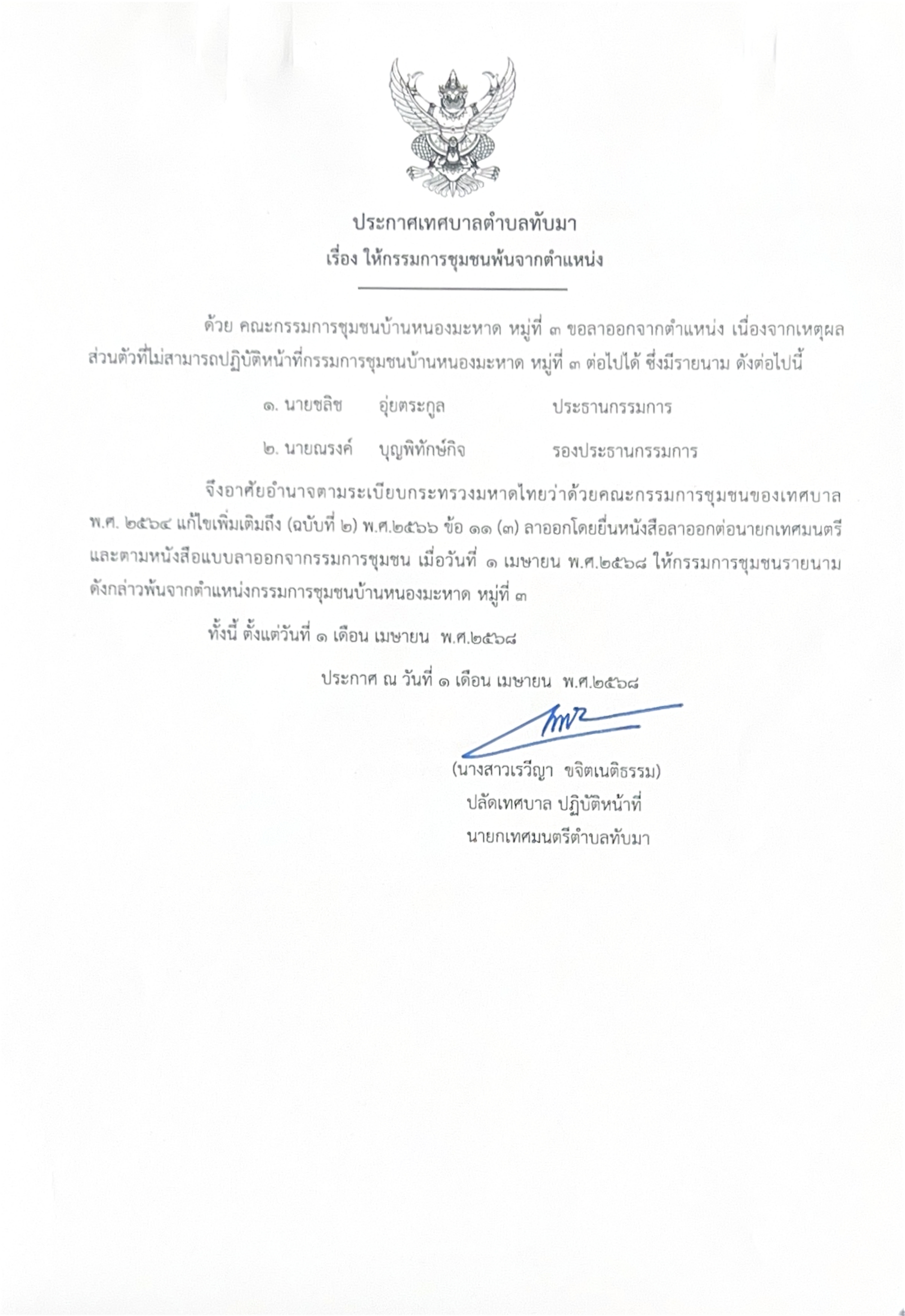ประกาศเทศบาลตำบลทับมา เรื่อง ให้กรรมการชุมชนพ้นจากตำแหน่ง