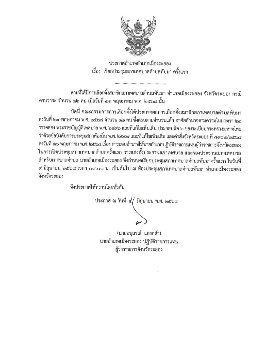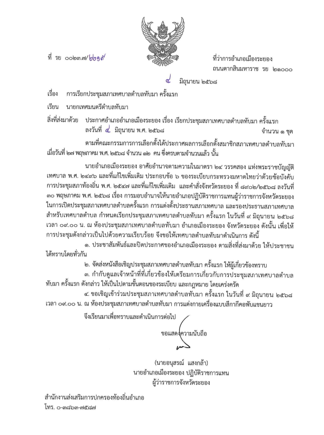 ประกาศอำเภออำเภอเมืองระยอง เรื่อง เรียกประชุมสภาเทศบาลตำบลทับมา ครั้งแรก