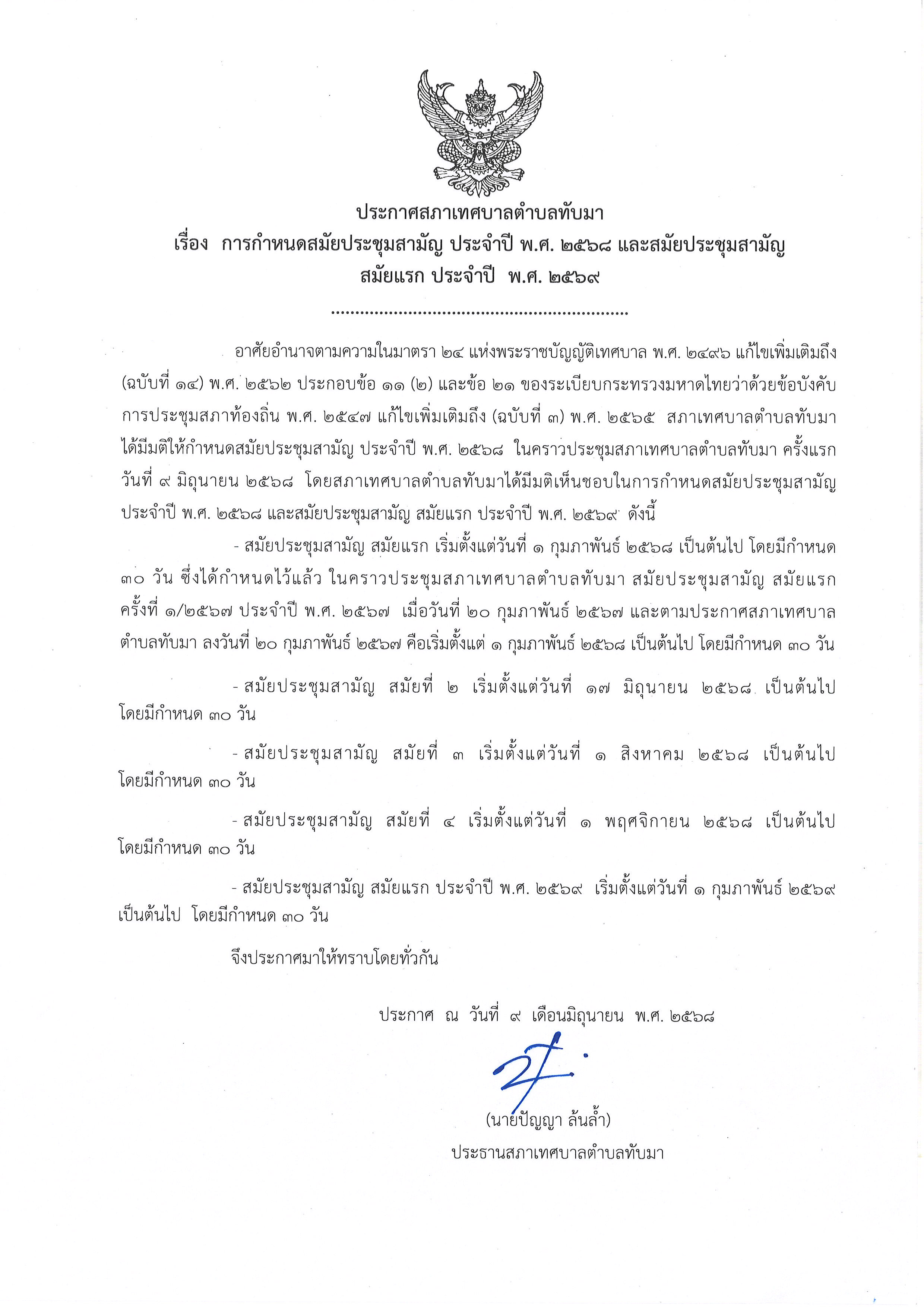 ประกาศสภาเทศบาลตำบลทับมา เรื่อง การกำหนดสมัยประชุมสามัญ ประจำปี พ.ศ.2568 และสมัยประชุมสมัยสามัญ สมัยแรก ประจำปี พ.ศ.2569