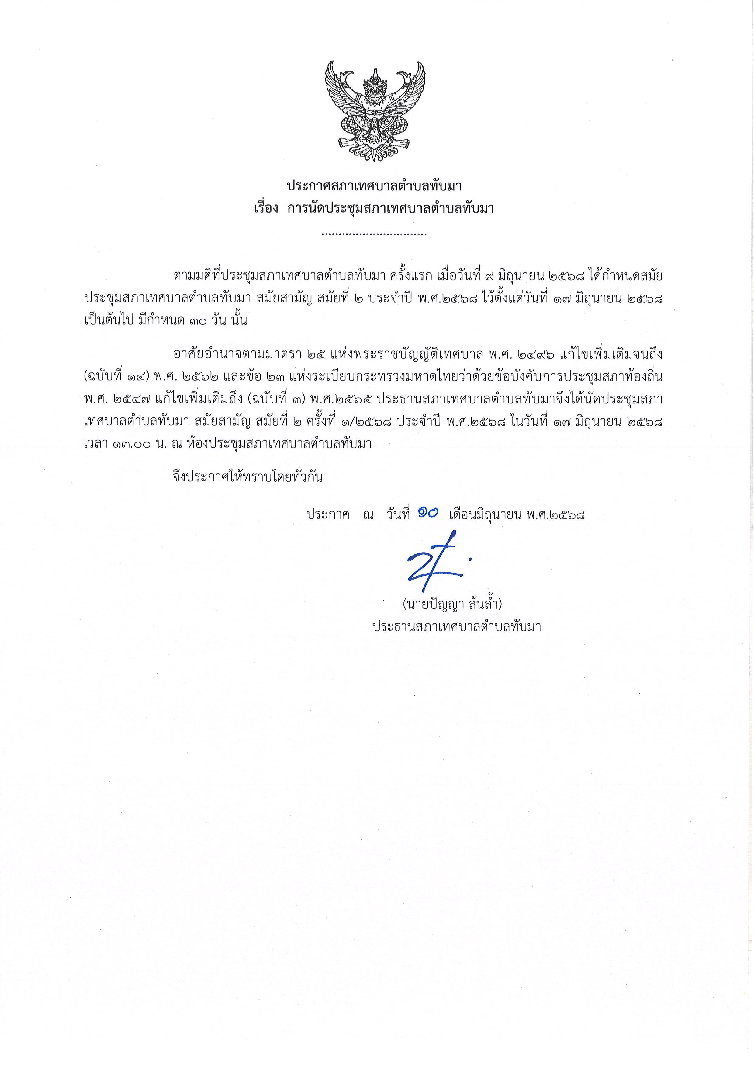 ประกาศสภาเทศบาลตำบลทับมา เรื่อง การนัดประชุมสภาเทศบาลตำบลทับมา สมัยสามัญ สมัยที่ 2 ครั้งที่ 1/2568 ประจำปี พ.ศ.2568