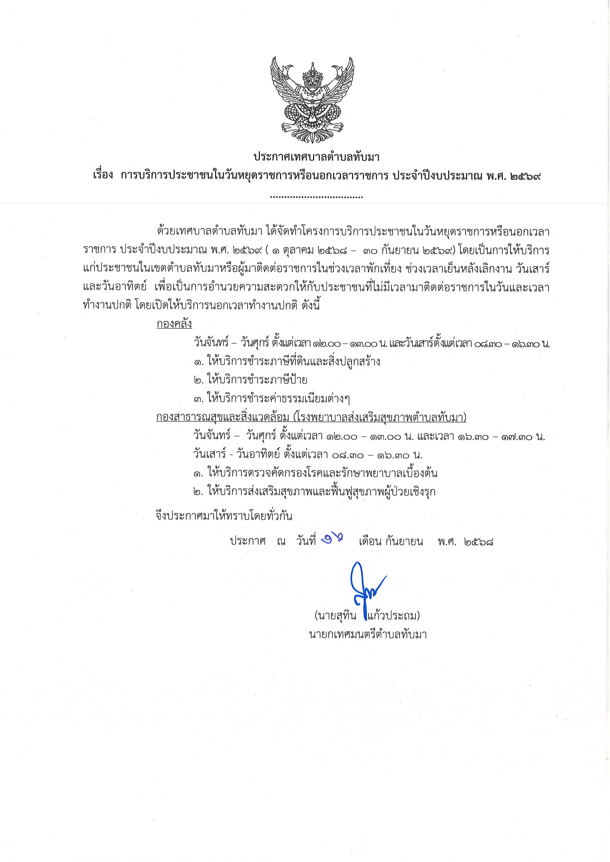 ชื่อเรื่อง : ประกาศเทศบาลตำบลทับมา เรื่อง การบริการประชาชนในวันหยุดราชการหรือนอกเวลาราชการ ประจำปีงบประมาณ พ.ศ.2569