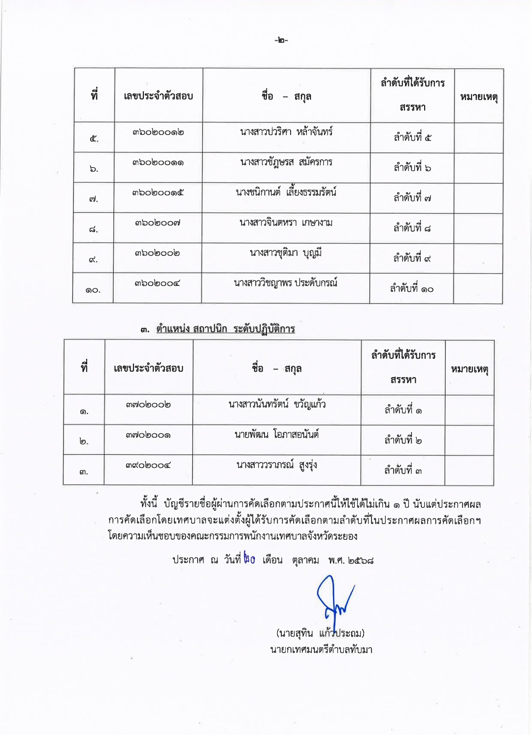 ประกาศเทศบาลตำบลทับมา เรื่อง ผลการคัดเลือกบุคคลทั่วไปเพื่อบรรจุและแต่งตั้งให้ดำรงตำแหน่งพนักงานเทศบาลในกรณีที่มีเหตุพิเศษที่ไม่จำเป็นต้องสอบแข่งขัน