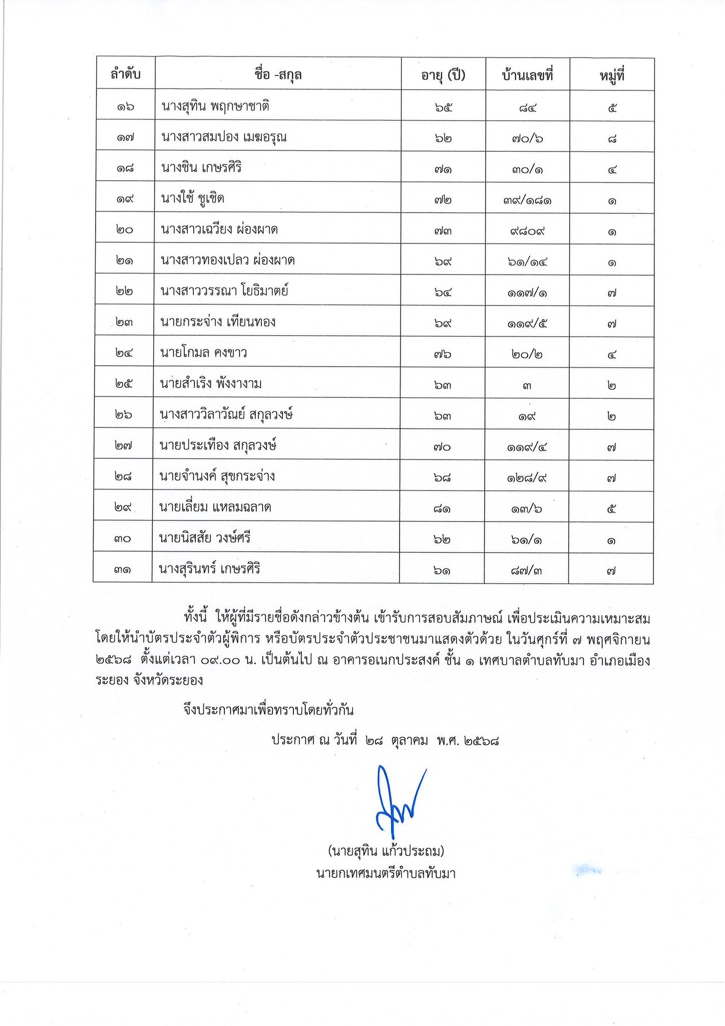 รายละเอียด : -ให้ผู้ที่มีรายชื่อดังกล่าวข้างต้น เข้ารับการสอบสัมภาษณ์ เพื่อประเมินความเหมาะสม โดยให้นำบัตรประจำตัวผู้พิการ หรือบัตรประจำตัวประชาชนมาแสดงตัวด้วย ในวันศุกร์ที่ 7 พฤศจิกายน 2568 ตั้งแต่เวลา 09.๐๐ น. เป็นต้นไป ณ อาคารอเนกประสงค์ ชั้น 1 เทศบาลตำบลทับมา อำเภอเมืองระยอง จังหวัดระยอง