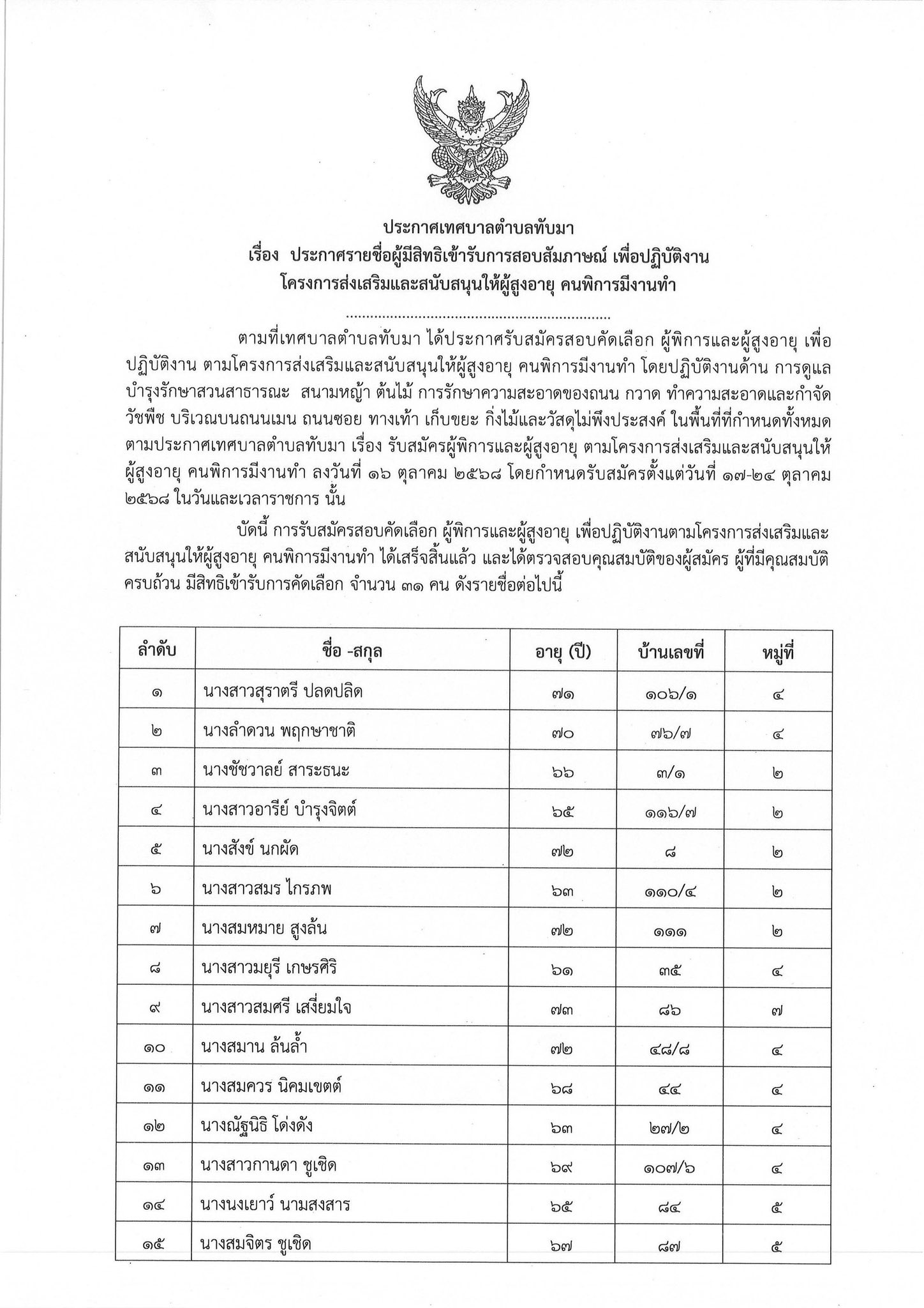 ชื่อเรื่อง : ประกาศเทศบาลตำบลทับมา เรื่อง ประกาศรายชื่อผู้มีสิทธิเข้ารับการสอบสัมภาษณ์ เพื่อปฏิบัติงาน โครงการส่งเสริมและสนับสนุนให้ผู้สูงอายุ คนพิการมีงานทำ ปีงบประมาณ 2569