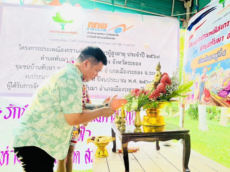 description วันที่ 19 เมษายน 2569 เวลา 16:00 น. ณ ร้านอาหารครัวบ้านนุ่น หมู่ที่ 4 ตำบลทับมา อำเภอเมืองระยอง จังหวัดระยอง เทศบาลตำบลทับมา ร่วมกับกองทุนพัฒนาไฟฟ้าเขตนิคมอุตสาหกรรมมาบตาพุด จังหวัดระยอง จัดโครงการประเพณีสงกรานต์ รดน้ำผู้สูงอายุ เพื่ออนุรักษ์และสืบสานวัฒนธรรมอันดีงามของไทย ในการนี้ นายสุทิน แก้วประถม นายกเทศมนตรีตำบลทับมา พร้อมด้วยคณะผู้บริหาร สมาชิกสภาเทศบาลตำบลทับมา กำนัน ผู้ใหญ่บ้าน และผู้นำชุมชน ได้นำพี่น้องประชาชนเข้าร่วมกิจกรรมอย่างพร้อมเพรียง โดยมีกิจกรรม สรงน้ำพระพุทธรูป และรดน้ำขอพรผู้สูงอายุ เพื่อความเป็นสิริมงคลแก่ตนเองและครอบครัว กิจกรรมดังกล่าวจัดขึ้นเพื่อแสดงออกถึงความเคารพ ความกตัญญูกตเวทีต่อบิดามารดา ผู้ใหญ่ และผู้มีพระคุณ อีกทั้งยังเป็นการส่งเสริมความรัก ความอบอุ่น และความสามัคคีในชุมชนให้คงอยู่สืบไป ภาพ : อรรถพล ข่าว : โสภณ person admin