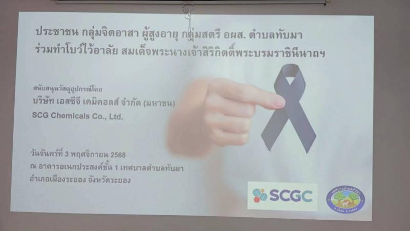 รายละเอียด : วันที่ 3 พฤศจิกายน 2568 เวลา 09.00 น. ณ ห้องประชุมชั้น 1 อาคารเอนกประสงค์ตึก 5 ชั้น เทศบาลตำบลทับมา อำเภอเมือง จังหวัดระยอง นายสุทิน แก้วประถม นายกเทศมนตรีตำบลทับมา พร้อมด้วยคณะผู้บริหาร หัวหน้าส่วนราชการ ร่วมกับบริษัท เอสซีจี เคมิคอลส์ จำกัด (มหาชน) ประชาชนกลุ่มจิตอาสา ผู้สูงอายุ กลุ่มสตรี และ อผส. พนักงานและเจ้าหน้าที่เทศบาลตำบลทับมา ร่วมจัดทำโบว์สีดำเพื่อแจกจ่ายให้ประชาชนในพื้นที่ นำไปติดเสื้อผ้า พร้อมทั้งติดเข็มกลัดให้สามารถนำไปติดเสื้อในกรณีที่ประชาชนไม่มีเสื้อผ้าสีดำ เป็นการลดค่าใช้จ่าย ซึ่งได้รับการสนับสนุนวัสดุอุปกรณ์ อาหารว่าง น้ำดื่ม โดย บริษัท เอสซีจี เคมิคอลส์ จำกัด (มหาชน) SCG Chemicals ทั้งนี้ เพื่อถวายความอาลัย แสดงความจงรักภักดี และน้อมรำลึกในพระมหากรุณาธิคุณสมเด็จพระนางเจ้าสิริกิติ์ พระบรมราชินีนาถ พระบรมราชชนนีพันปีหลวง