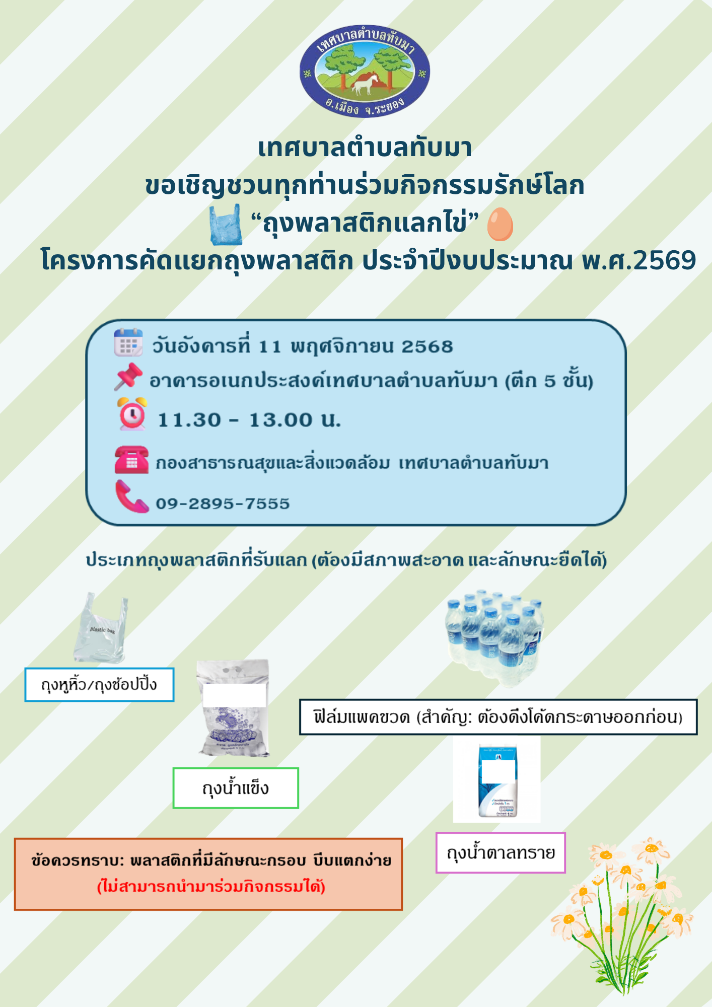 ประชาสัมพันธ์ กองสาธารณสุขและสิ่งแวดล้อม เทศบาลตำบลทับมา เชิญทุกท่านเข้าร่วมกิจกรรม "ถุงพลาสติกแลกไข่" [10 พฤศจิกายน 2568]
