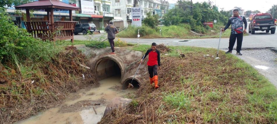 เทศบาลตำบลทับมา ลงพื้นที่ตรวจสอบและนำขยะออกจากท่อระบายน้ำในฤดูฝน [6 กันยายน 2568]