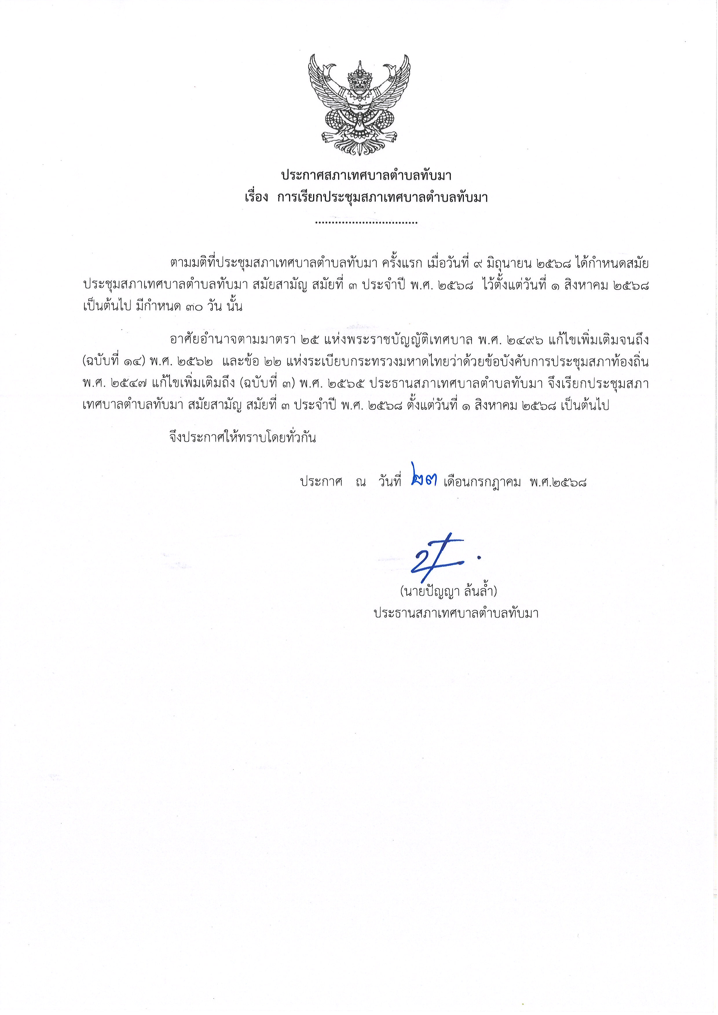 ประกาศสภาเทศบาลตำบลทับมา เรื่อง การเรียกประชุมสภาเทศบาลตำบลทับมา สมัยสามัญ สมัยที่ 3 ประจำปี พ.ศ.2568