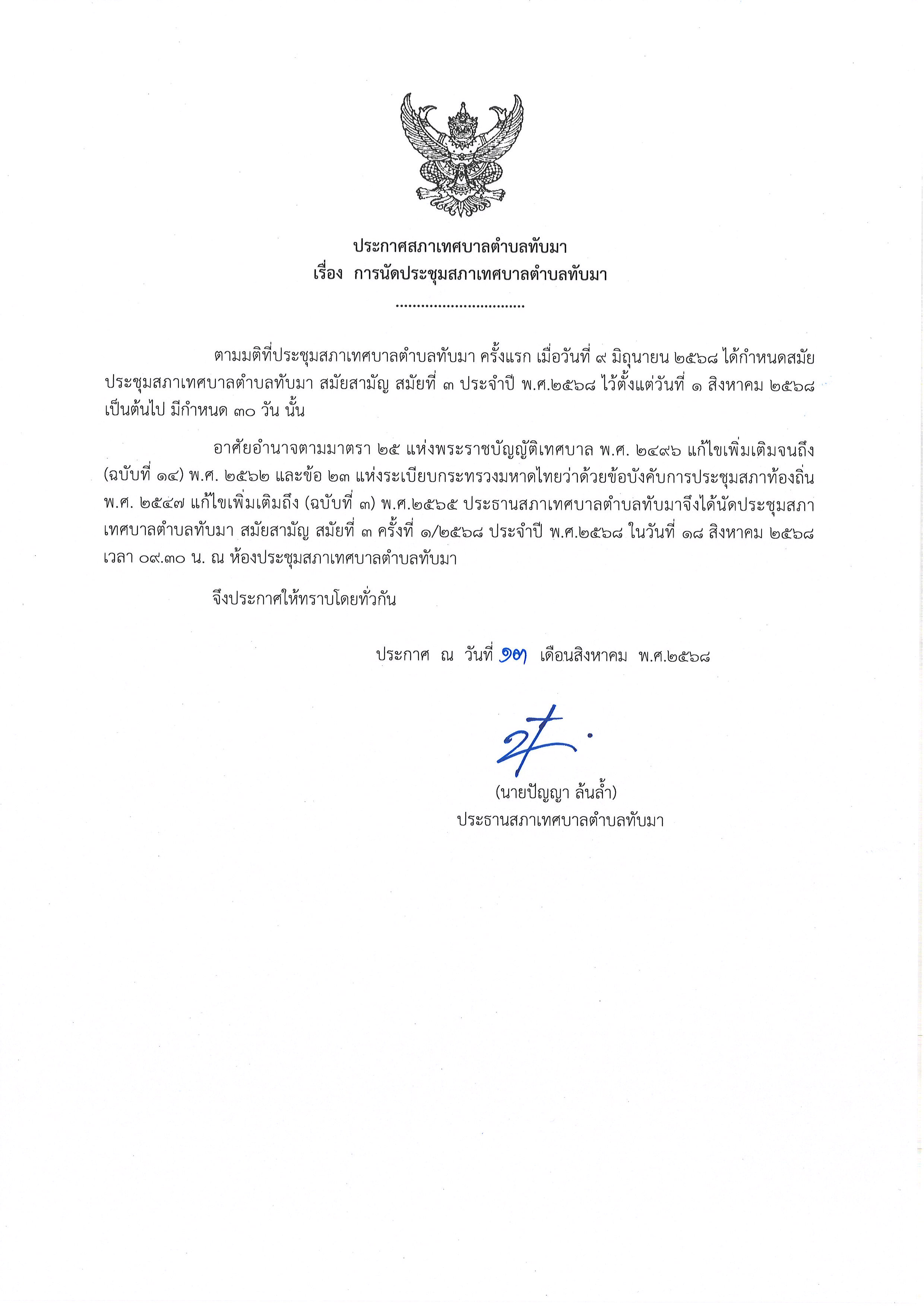 ประกาศสภาเทศบาลตำบลทับมา เรื่อง การนัดประชุมสภาเทศบาลตำบลทับมา สมัยสามัญ สมัยที่ 3 ครั้งที่ 1/ 2568 ประจำปี พ.ศ.2568