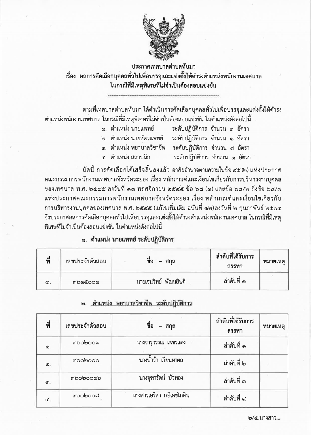 ประกาศเทศบาลตำบลทับมา เรื่อง ผลการคัดเลือกบุคคลทั่วไปเพื่อบรรจุและแต่งตั้งให้ดำรงตำแหน่งพนักงานเทศบาลในกรณีที่มีเหตุพิเศษที่ไม่จำเป็นต้องสอบแข่งขัน