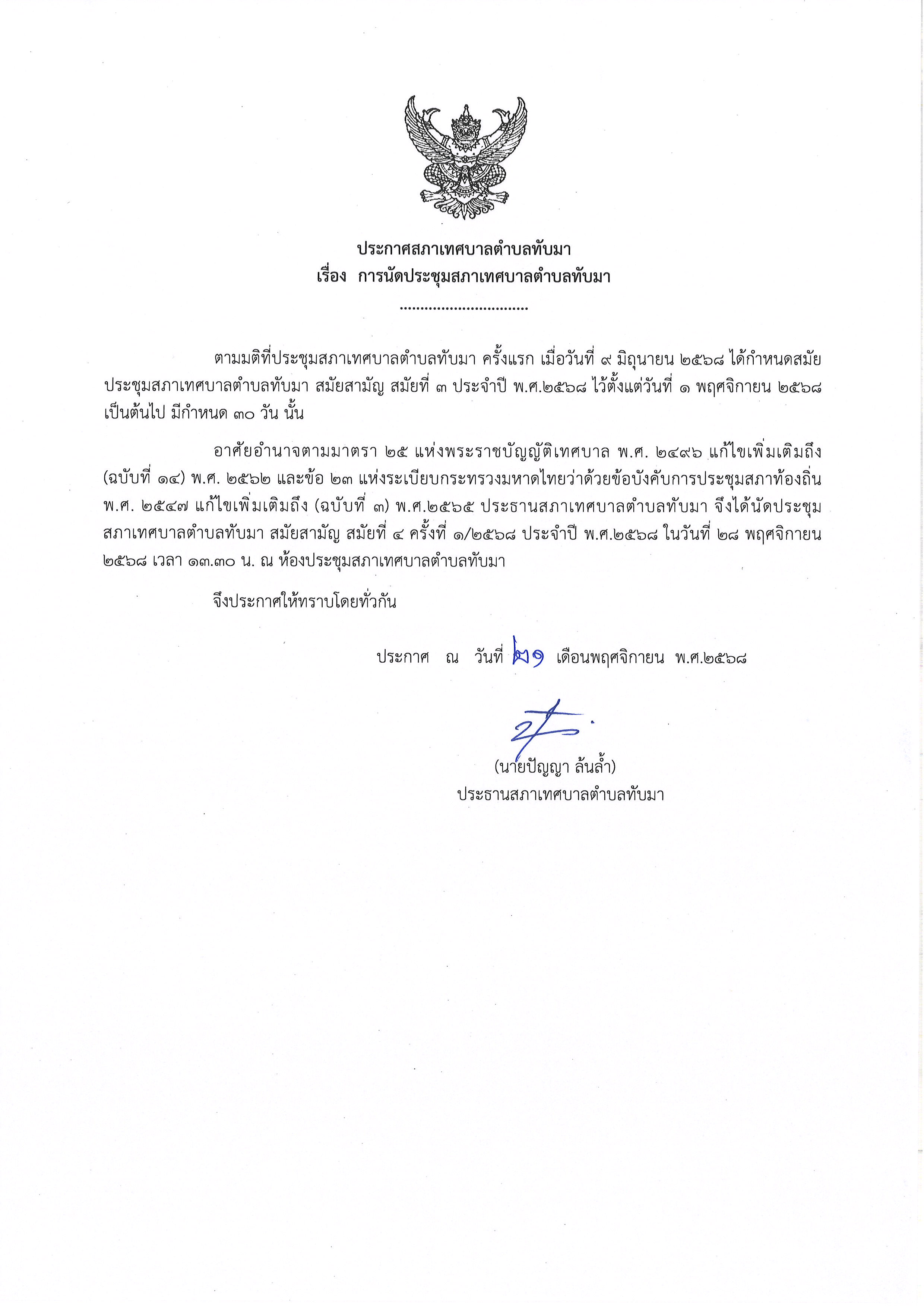 ประกาศสภาเทศบาลตำบลทับมา เรื่อง การนัดประชุมสภาเทศบาลตำบลทับมา สมัยสามัญ สมัยที่ 4 ครั้งที่ 1/2568 ประจำปี พ.ศ.2568