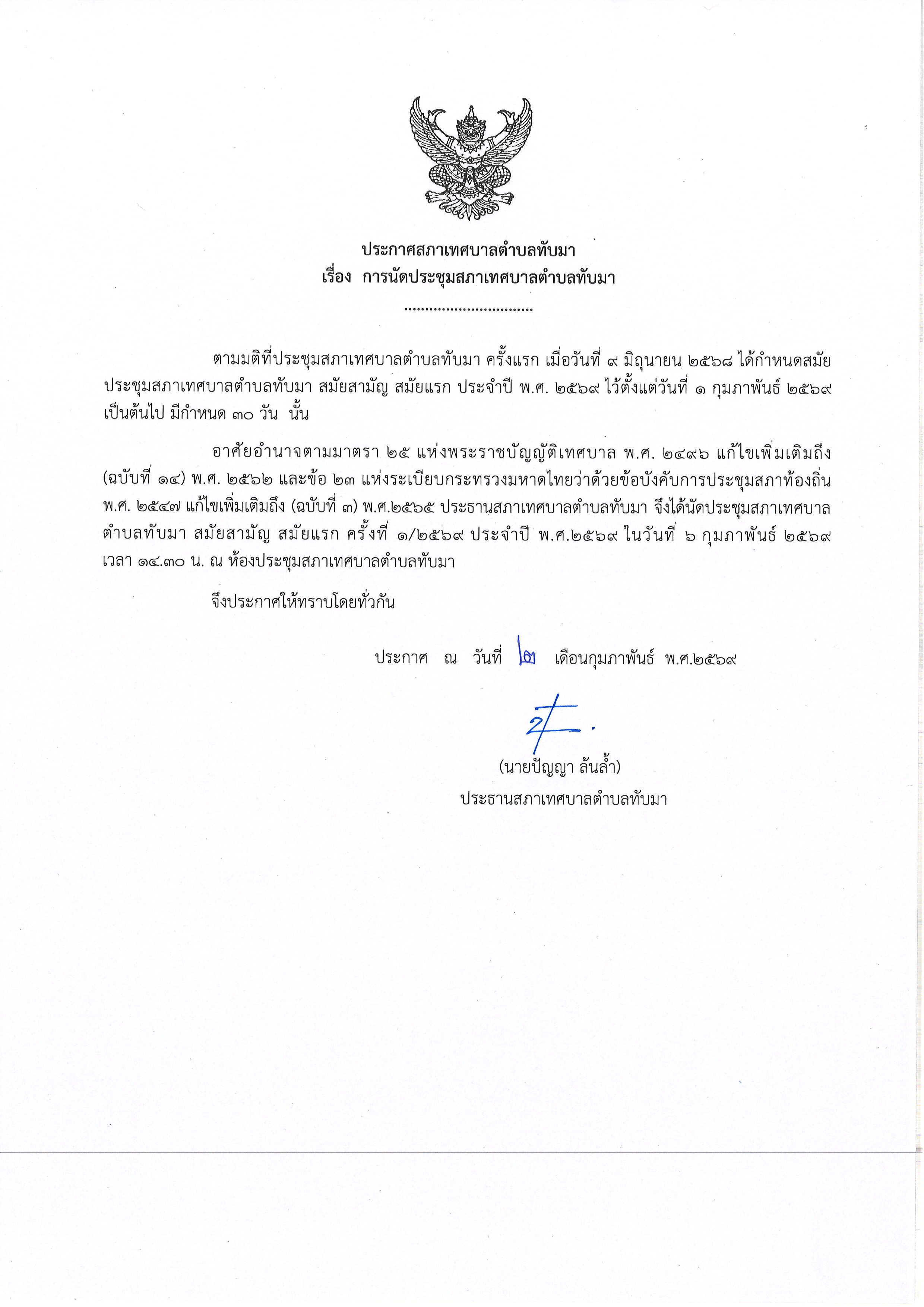 ประกาศสภาเทศบาลตำบลทับมา เรื่อง การนัดประชุมสภาเทศบาลตำบลทับมา สมัยสามัญ สมัยแรก ครั้งที่ 1/2569 ประจำปี พ.ศ.2569